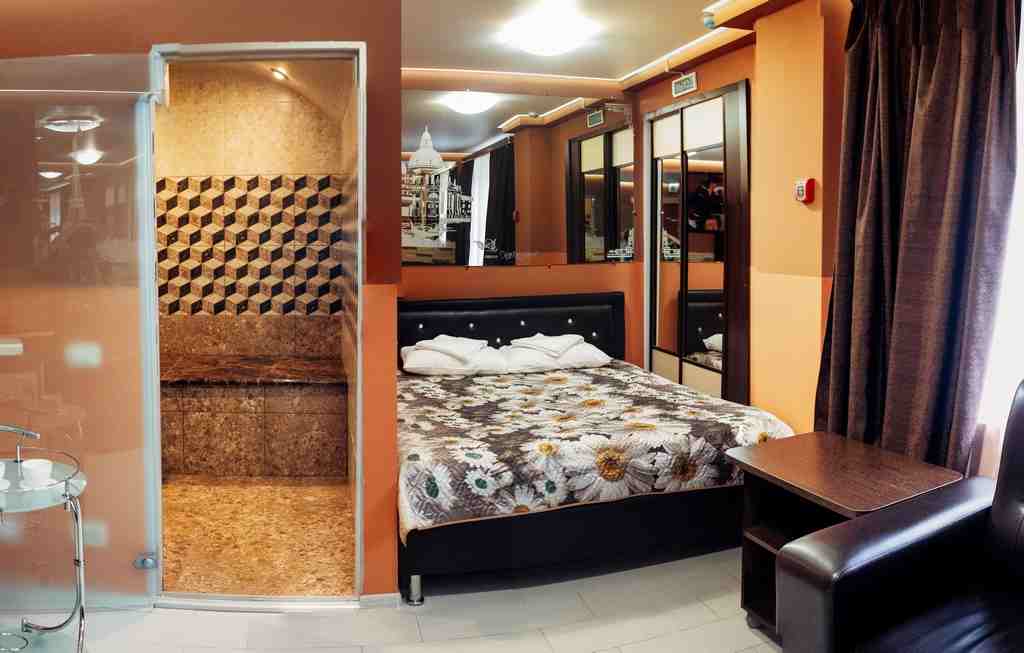 В номере: двуспальная кровать, собственная ванная комната, стол, диван, микроволновая печь, холодильник, чайник, телевизор, интернет (wi-fi), фен, банные принадлежности, постельное белье, полотенца, халат
